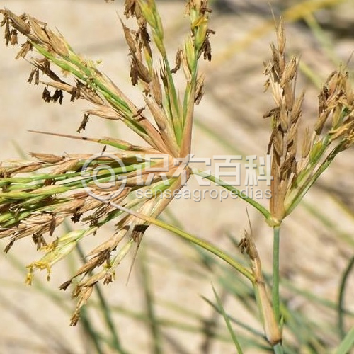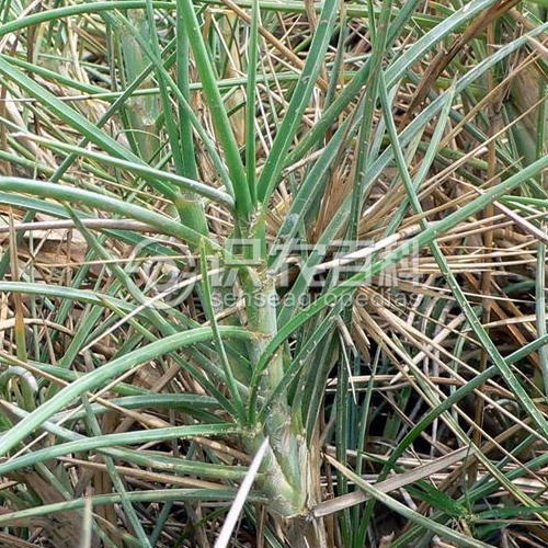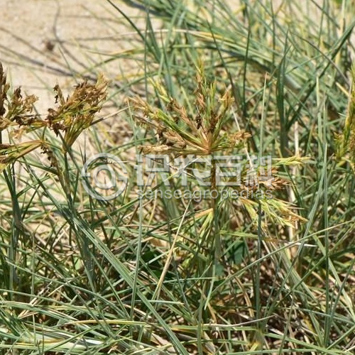 須根長而堅韌。稈粗壯、堅實,表面被白蠟質,平臥地面部分長達數米,向上直立部分高30-100厘米,徑粗3-5毫米。葉鞘寬闊,基部達1.4厘米,無毛或微被毛,邊緣具緣毛,常互相覆蓋;葉舌微小,頂端有長2-3毫米的不整齊白色纖毛;葉片線形,質堅而厚,長5-20厘米,寬2-3毫米,下部對折,上部卷合如針狀,常呈弓狀彎曲,邊緣粗糙,無毛。雄穗軸長4-9厘米,生數枚雄小穗,先端延伸于頂生小穗之上而成針狀:雄小穗長9-11毫米,柄長約1毫米;穎草質,廣披針形,先端急尖,具7-9脈,第一穎長約為小穗的1/2,第二穎長約為小穗的2/3;外稃長8-10毫米,具5脈:內稃與外稃近等長,具2脈;花藥線形,長約5毫米;雌穗軸針狀,長6-16厘米、粗糙,基部單生1雌小穗;雌小穗長約12毫米;穎草質,具11-13脈,第一穎略短于小穗;第一外稃具5脈,與小穗等長,無內稃;第二外稃厚紙質,具5脈,內稃與之近等長。花果期夏秋季。