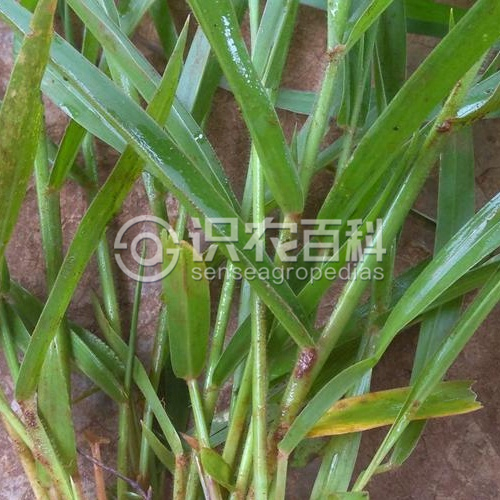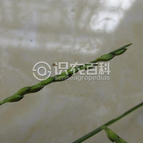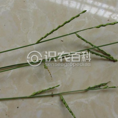 高30-40厘米。稈纖細(xì),基部傾斜,節(jié)上生根,多分枝,節(jié)帶具白柔毛。葉鞘無毛或鞘緣疏生疣毛;葉舌退化呈一圈白色繸毛;葉片線狀披針形,扁平,內(nèi)卷,長1.5-10.5厘米,寬3-6毫米,邊緣齒狀粗糙,密生脫落性細(xì)毛。圓錐花序由4-5枚總狀花序組成,總狀花序長5-12厘米;穗軸被纖毛,棱邊粗糙;小穗卵形,長約2毫米,被纖毛,具長約0.2毫米的柄;第一穎長0.2-0.3毫米,膜質(zhì),無毛,頂端下凹;第二穎與小穗等長,具5脈,第一外稃與第二穎同形,具5脈,內(nèi)稃狹窄;第二外稃長圓形,堅硬,光滑,長約1.5毫米,邊緣稍內(nèi)卷,包著同質(zhì)的內(nèi)稃。