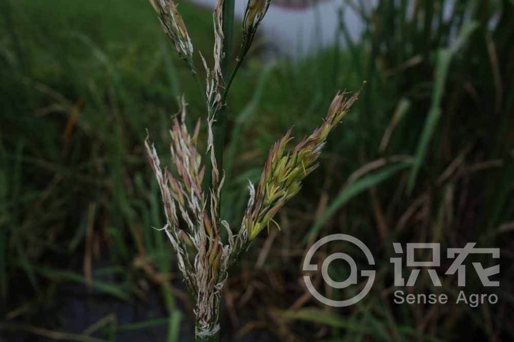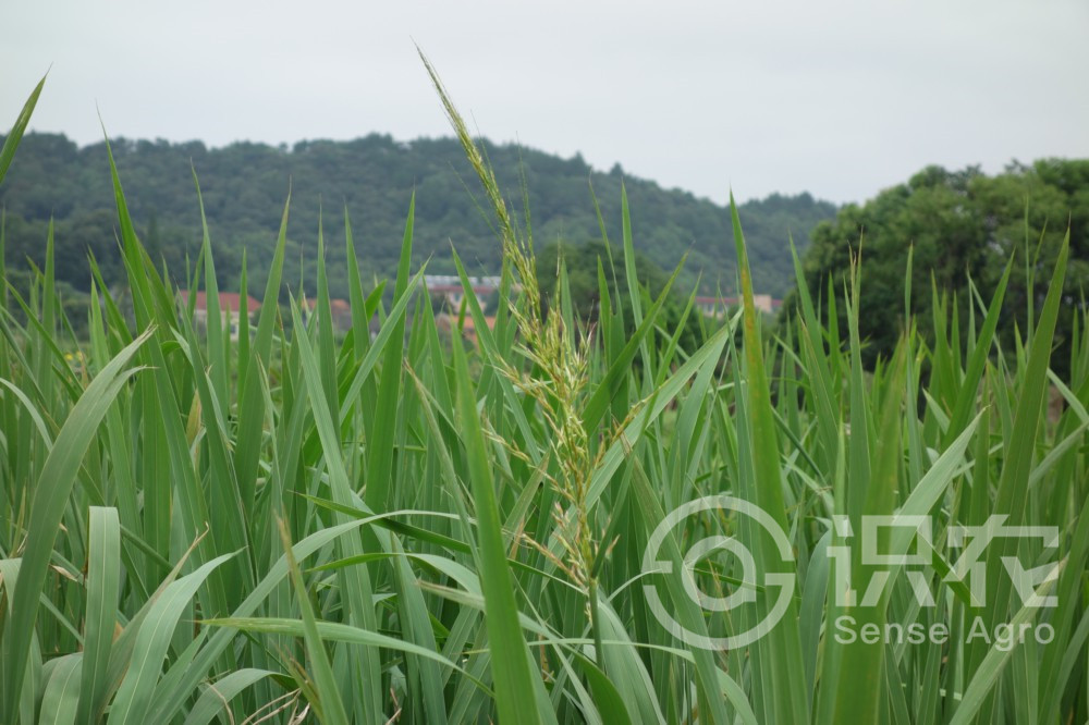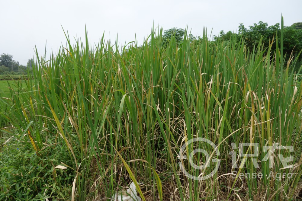 具匍匐根狀莖。須根粗壯。稈高大直立,高1-2米,徑約1厘米,具多數節,基部節上生不定根。葉鞘長于其節間,肥厚,有小橫脈;葉舌膜質,長約1.5厘米,頂端尖;葉片扁平寬大,長50-90厘米,寬15-30毫米。圓錐花序長30-50厘米,分枝多數簇生,上升,果期開展;雄小穗長10-15毫米,兩側壓扁,著生于花序下部或分枝之上部,帶紫色,外稃具5脈,頂端漸尖具小尖頭,內稃具3脈,中脈成脊,具毛,雄蕊6枚,花藥長5-10毫米;雌小穗圓筒形,長18-25毫米,寬1.5-2毫米,著生于花序上部和分枝下方與主軸貼生處,外稃之5脈粗糙,芒長20-30毫米,內稃具3脈。穎果圓柱形,長約12毫米,胚小形,為果體之1/8。