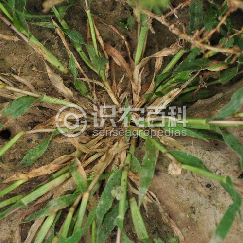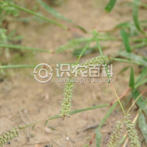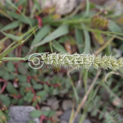 須根細(xì)弱。莖叢生,基部常膝曲而伏臥地面,高15-25厘米。葉鞘短于節(jié)間,無毛;葉舌纖毛狀;葉片長3-8厘米,寬2-4毫米,邊緣加厚,軟骨質(zhì),疏生小刺毛。花序緊密呈穗狀,長3-6厘米,寬約8毫米,小穗長4-4.5毫米,通常3個簇生,其中1個退化,或幾殘存為柄狀;第一穎退化或極微小,薄膜質(zhì),第二穎革質(zhì),背部有5(-7)肋,肋上具鉤刺,頂端具明顯伸出刺外的小頭;外稃膜質(zhì),長約3毫米,具3條不太明顯的脈;內(nèi)稃較外稃稍短,脈不明顯;雄蕊3枚,花柱2裂,柱頭2,帚狀,均較簡短。穎果棕褐色,稍扁,長2-3毫米。花果期7-9月。