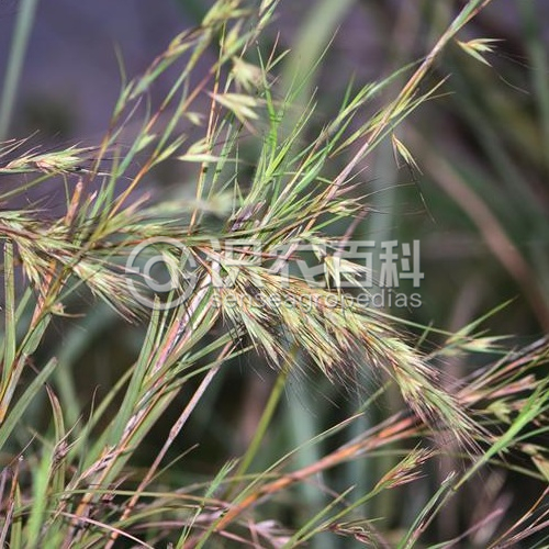 稈高0.5-1.5米,圓形,壓扁或具棱,下部直徑可達(dá)5毫米,光滑無(wú)毛,具光澤,黃白色或褐色,實(shí)心,髓白色,有時(shí)節(jié)處被白粉。葉鞘緊裹稈,背部具脊,通常生疣基硬毛;葉舌堅(jiān)紙質(zhì),長(zhǎng)1-2毫米,頂端鈍圓,有睫毛;葉片線形,長(zhǎng)10-50厘米,寬4-8毫米,基部通常近圓形,頂部漸尖,中脈顯著,兩面無(wú)毛或疏被柔毛,背面常粉白色,邊緣略卷曲,粗糙。大型偽圓錐花序多回復(fù)出,由具佛焰苞的總狀花序組成,長(zhǎng)為全株的1/3-1/2;佛焰苞長(zhǎng)2-3厘米;總狀花序長(zhǎng)15-17毫米,具長(zhǎng)2-5毫米的花序梗,由7小穗組成。下部總苞狀小穗對(duì)輪生于一平面,無(wú)柄,雄性,長(zhǎng)圓狀披針形,長(zhǎng)7-10毫米;第一穎背面上部常生瘤基毛,具多數(shù)脈。無(wú)柄小穗兩性,1枚,紡錘狀圓柱形,長(zhǎng)8-10毫米,基盤(pán)被褐色髯毛,銳利;第一穎草質(zhì),背部圓形,頂端鈍,被短剛毛,第二穎與第一穎同質(zhì),等長(zhǎng),兩邊為第一穎所包卷。第一外稃短于穎;第二外稃退化為芒的基部,芒長(zhǎng)3-6厘米,1-2回膝曲;穎果長(zhǎng)圓形,胚線形,長(zhǎng)為穎果的1/2。有柄小穗形似總苞狀小穗,但較短,雄性或中性。花果期6-12月。