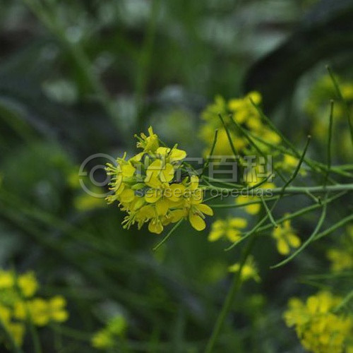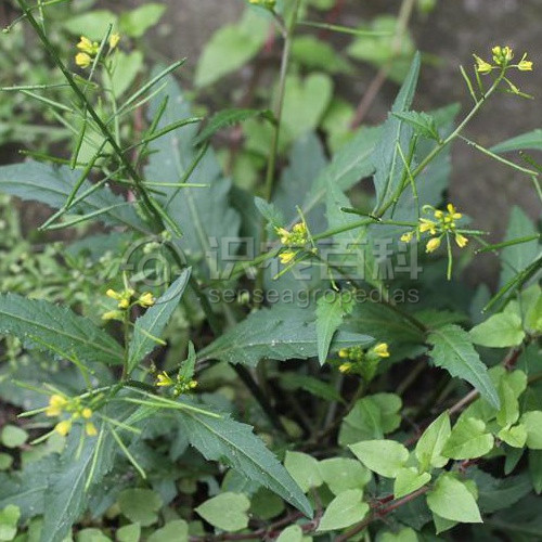 高20-40厘米,植株較粗壯,無毛或具疏毛。莖單一或分枝,表面具縱溝。葉互生,基生葉及莖下部葉具長柄,葉形多變化,通常大頭羽狀分裂,長4-10厘米,寬1.5-2.5厘米,頂端裂片大,卵狀披針形,邊緣具不整齊牙齒,側裂片1-5對;莖上部葉片寬披針形或匙形,邊緣具疏齒,具短柄或基部耳狀抱莖。總狀花序頂生或側生,花小,多數,具細花梗;萼片4,卵狀長圓形,長3-4毫米;花瓣4,黃色,匙形,基部漸狹成短爪,與萼片近等長;雄蕊6,2枚稍短。長角果線狀圓柱形,短而粗,長1-2厘米,寬1-1.5毫米,直立或稍內彎,成熟時果瓣隆起;果梗纖細,長3-5毫米,斜升或近水平開展。種子每室2行,多數,細小,卵圓形而扁,一端微凹,表面褐色,具細網紋;子葉緣倚胚根。花期4-6月,果期6-8月。