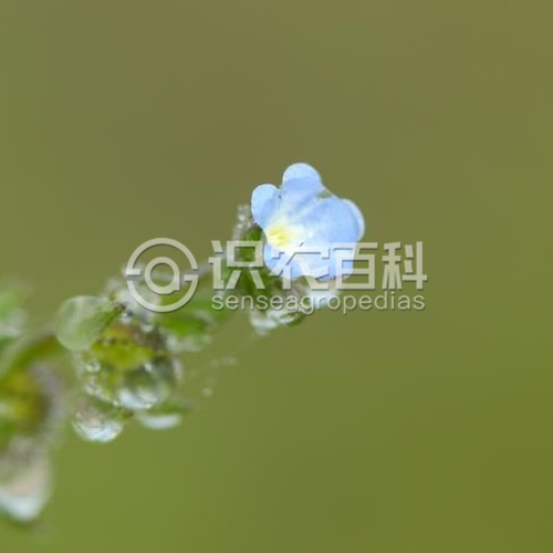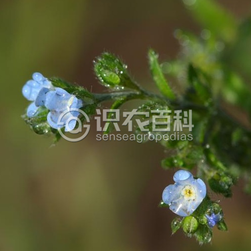 一年生或二年生草本,高達60余厘米。莖通常單生,稀2-3個簇生,上部具分枝,被糙伏毛或開展的硬毛。基生葉長圓狀披針形,長達5厘米,密生白色長硬毛,果期均枯萎;莖生葉披針形或線形,長2-5厘米,寬3-6毫米,扁平或沿中肋對折,先端鈍,基部漸狹,兩面密被具基盤的長硬毛,中脈在上面凹陷、下面明顯突起。花序生莖及小枝頂端,果期伸長,長7-25厘米;苞片小,線形;果梗極短,長1-3毫米,被糙伏毛,直立;花萼深裂至基部,裂片線形,長2.5-3毫米,果期增大,長4-5毫米,呈星狀開展;花冠淡藍紫色,鐘狀,長3.5-4毫米,檐部直徑2.5-3毫米,裂片長圓形或寬倒卵形,喉部附屬物高約0.5毫米。果實寬卵狀,長約2.5-3毫米,寬約3.5毫米;小堅果尖卵狀,下半部寬,上部尖,故4個小堅果的基部相互靠緊而上部則有長圓形的空檔,背面狹卵形,具顆粒狀突起,邊緣具3行錨狀刺,第1行(內行)刺長約1.5毫米,細而硬,斜升或直立,基部略增寬但相互離生,第2行刺稍短而硬呈棒狀,第3行刺極短,僅生小堅果的腹面下部,小堅果腹面散生小疣狀突起而其空檔處平滑且有光澤;花柱伸出小堅果約1毫米。花期6-7月,果期7-9月。
