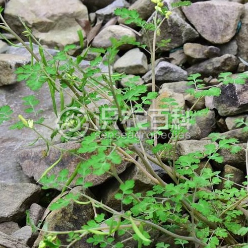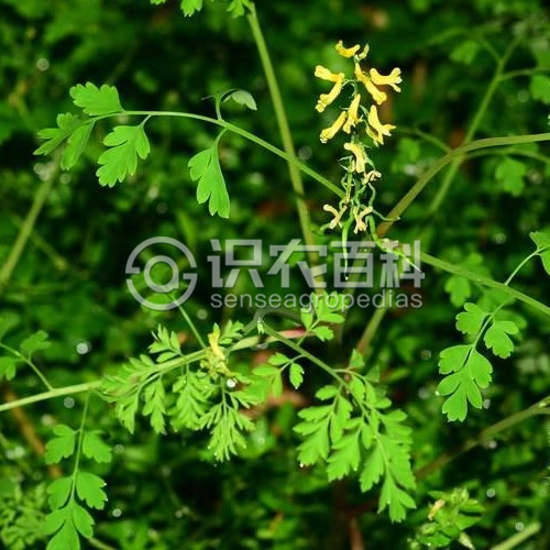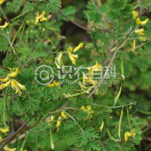 灰綠色叢生草本,高30-50厘米,具主根。莖具棱,分枝,具葉,枝條花葶狀,對葉生。基生葉具長柄,常早枯萎。莖生葉具短柄,葉片三角形,上面綠色,下面灰白色,二回羽狀全裂,一回羽片約3-4對,具短柄,二回羽片1-2對,卵圓形至寬卵圓形,約長2厘米,寬1.5厘米,通常二回三深裂,末回裂片圓鈍,近具短尖。總狀花序長3-10厘米,密具多花,后漸疏離。苞片披針形至鉆形,漸尖至具短尖,約與花梗等長。花梗長3-5毫米。花黃色至淡黃色。萼片小,卵圓形,早落。外花瓣不寬展,無雞冠狀突起,頂端通常近圓,具寬短尖,有時近下凹,有時具較長的短尖。上花瓣長約6-7毫米;距短囊狀,約占花瓣全長的1/5-1/6;蜜腺體約占距長的1/2。子房線形,近扭曲,約與花柱等長;柱頭寬淺,具4乳突,頂生2枚呈廣角狀叉分,側生的先下彎再弧形上升。蒴果線形,具1列種子。種子黑亮,近腎形,具短刺狀突起,種阜三角形。