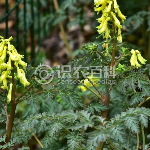 灰綠色叢生草本,高20-60厘米,具主根,少數側根發達,呈須根狀。莖1至多條,發自基生葉腋,具棱,常上部分枝?;~多數,蓮座狀,花期枯萎。莖生葉稍密集,下部的具柄,上部的近無柄,上面綠色,下面蒼白色,二回羽狀全裂,一回羽片約4-6對,具短柄至無柄,二回羽片無柄,卵圓形至長圓形,頂生的較大,約長1.5-2厘米,寬1.2-1.5厘米,三深裂,裂片邊緣具圓齒狀裂片,裂片頂端圓鈍,近具短尖,側生的較小,常具4-5圓齒??偁罨斏鸵干?,有時對葉生,長約5厘米,疏具多花和或長或短的花序軸。苞片披針形至長圓形,具短尖,約與花梗等長?;üiL4-7毫米?;S色至淡黃色,較粗大,平展。萼片近圓形,中央著生,直徑約1毫米,邊緣具齒。外花瓣頂端勺狀,具短尖,無雞冠狀突起,或有時僅上花瓣具淺雞冠狀突起。上花瓣長1.7-2.3厘米;距約占花瓣全長的1/3,背部平直,腹部下垂,稍下彎;蜜腺體約占距長的2/3,末端鉤狀彎曲。下花瓣長約1.4厘米。內花瓣長約1.3厘米,具雞冠狀突起,爪約與瓣片等長。雄蕊束披針形。子房線形;柱頭具橫向伸出的2臂,各枝頂端具3乳突。蒴果線形,念珠狀,長2-4厘米,寬約2毫米,斜伸至下垂,具1列種子。種子黑亮,直徑約2毫米,表面密具圓錐狀突起,中部較低平;種阜帽狀,約包裹種子的1/2。