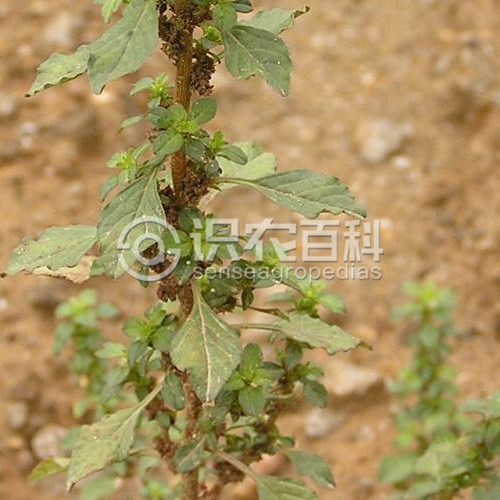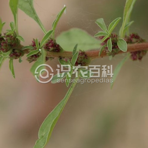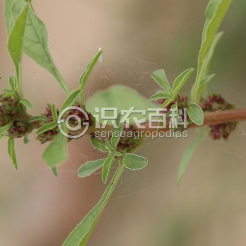 高30-65厘米;莖直立,多分枝,淡綠色,全體無毛。葉片菱狀卵形、倒卵形或矩圓形,長2-5厘米,寬1-2.5厘米,頂端微凹,具凸尖,基部楔形,波狀緣;葉柄長1-2.5厘米,纖細。花成腋生短花簇,花數(shù)少且疏生;苞片及小苞片鉆形,長2毫米,背面有1綠色隆起中脈,頂端具芒尖;花被片披針形,長2.5毫米,頂端漸尖,具芒尖;雄蕊比花被片短;柱頭3,反曲。胞果卵形,長3毫米,環(huán)狀橫裂,和宿存花被略等長。種子近球形,直徑約1毫米,黑棕色,邊緣加厚。花期7-8月,果期8-9月。