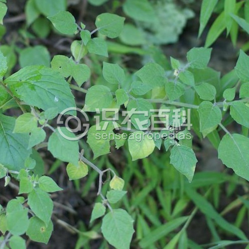 一年生草本;莖生柔毛,常多分枝,分枝毛較密。葉闊卵形,長3-8厘米,寬2-6厘米,頂端急尖,基部歪斜心形,邊緣通常有不等大的尖牙齒,兩面疏生毛但脈上毛較密;葉柄長3-8厘米,密生短柔毛。花單獨腋生,花梗長5-10毫米,密生短柔毛。花萼鐘狀,密生柔毛,5中裂,裂片披針形,急尖,邊緣有緣毛;花冠淡黃色,喉部具紫色斑紋,直徑6-10毫米;雄蕊短于花冠,花藥淡紫色,長1-2毫米。果萼卵狀,長2-3厘米,直徑2-2.5厘米,具5棱角和10縱肋,頂端萼齒閉合,基部稍凹陷;漿果球狀,直徑約1.2厘米,黃色或有時帶紫色。種子近圓盤狀,直徑約2毫米。花果期5-11月。